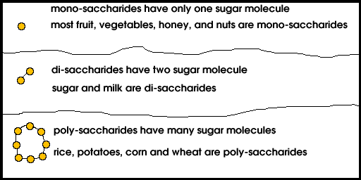 The simpler the structure of the carbohydrate, the more easily the body digests and absorbs it. Monosaccharides (single molecules of glucose, fructose, or galactose) require no splitting by digestive enzymes in order to be absorbed by the body. These are the sugars we rely on in the diet. They include those found in fruits, honey, some vegetables, and in yogurt.