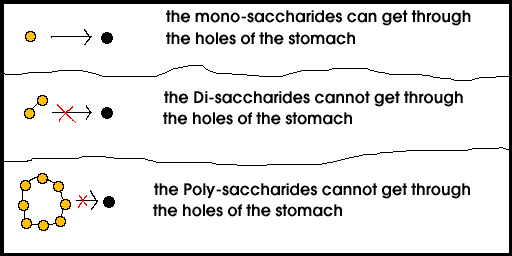 Monosaccharides are built out of one sugar molecule. The holes in the lining of the intestines are exactly the size of these sugar molecules. The body can readily use these saccharides when they pass through the holes and enter the bloodstream. They don't even have to be digested, since they can be absorbed directly by the intestines absorptive cells. Monosaccharides are primarily found in (ripe) fruit and honey (in the form of glucose and fructose).