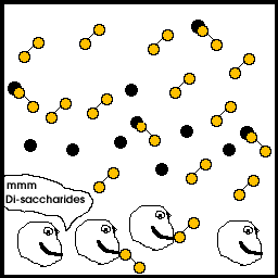 In a healthy person all these processes work perfectly. However, in a small group of people, the duodenum can't produce enough enzymes to digest all the carbohydrates (di- and polysaccharides). This is what happens next: Large amounts of undigested carbohydrates remain in the intestines. This would normally be no problem, because whatever the body doesn't utilize will end up in the toilet. However, the intestines also have natural inhabitants: Bacteria. The bacteria have been waiting for a long time for such a feast ! Lots and lots of disaccharides, their favorite meal !