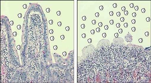 Damage to the mucosal layer involves injury to the microvilli of our absorptive cells. These microvilli act as the last barrier between the nutrition we take in and our bloodstream. As our absorption is inhibited, folic acid and vitamin B12 deficiency can lead to impaired development of microvilli, while an abnormally thick layer of mucus prevents contact between microvilli enzymes and the carbohydrates we ingest. The small intestine responds to this spiraling irritation by producing more goblet (mucus-making) cells, creating yet more mucus. Finally, as the goblet cells become exhausted, the intestinal surface is laid bare, and is further damaged, and possibly ulcerated.