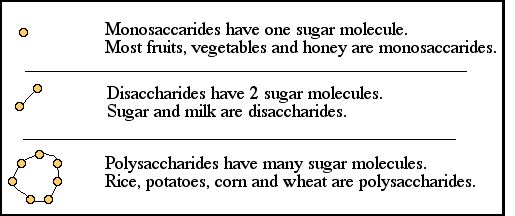 The simpler the structure of the carbohydrate, the more easily the body digests and absorbs it. Monosaccharides (single molecules of glucose, fructose, or galactose) require no splitting by digestive enzymes in order to be absorbed by the body. These are the sugars we rely on in the diet. They include those found in fruits, honey, some vegetables, and in yogurt.