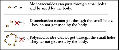 Monosaccharides are built out of one sugar molecule. The holes in the lining of the intestines are exactly the size of these sugar molecules. The body can readily use these saccharides when they pass through the holes and enter the bloodstream. They don't even have to be digested, since they can be absorbed directly by the intestines absorptive cells. Monosaccharides are primarily found in (ripe) fruit and honey (in the form of glucose and fructose).