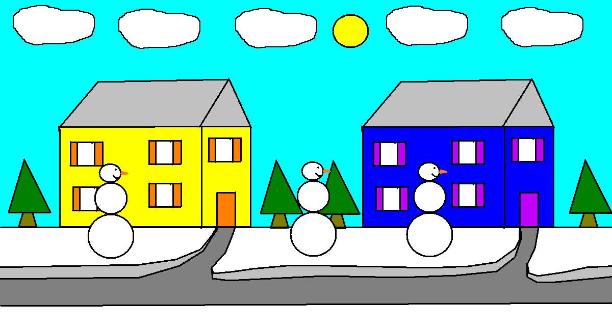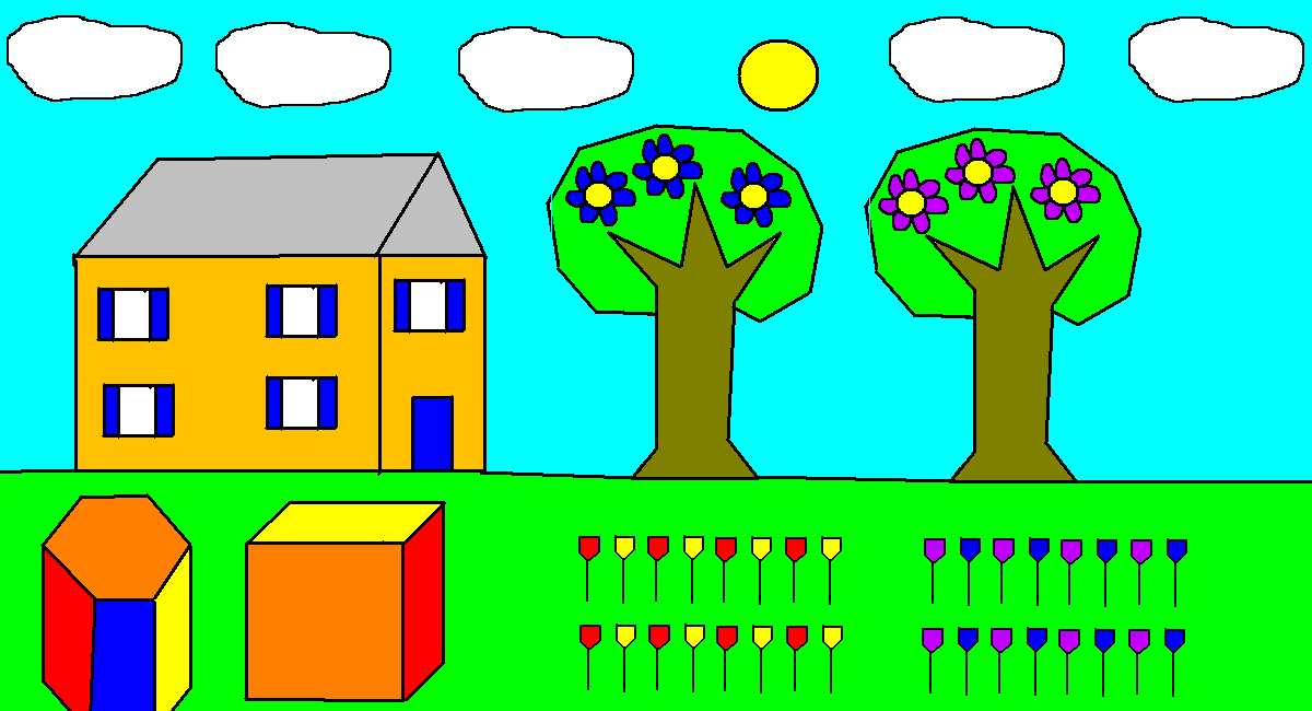 view | a picture of a house ,2 shapes and flowers on the trees |