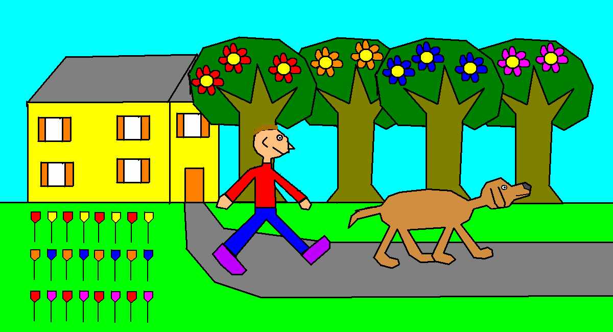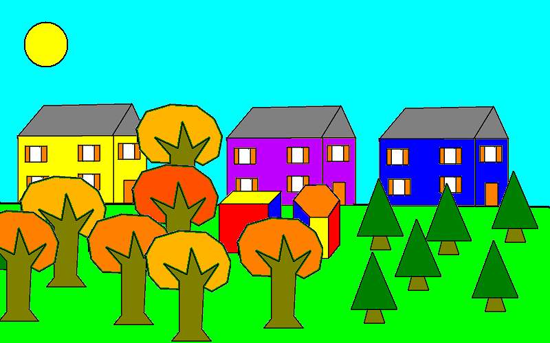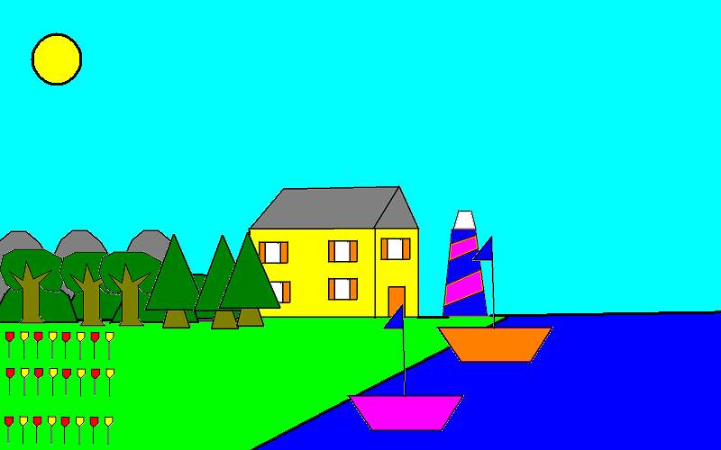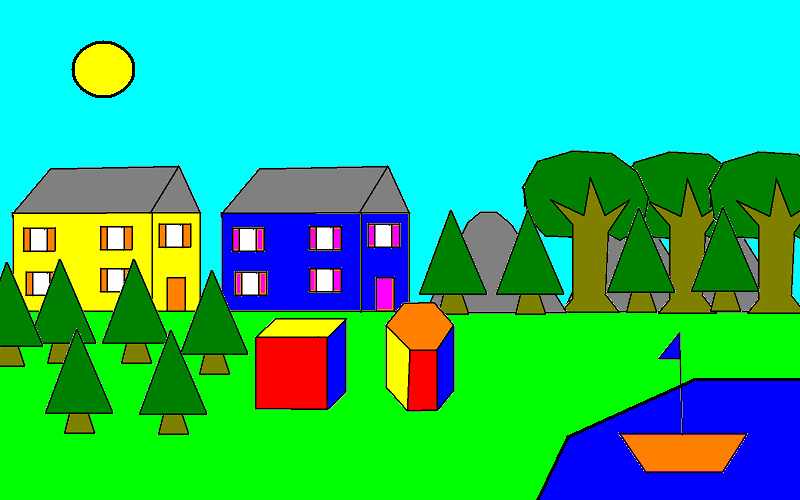 view | a picture of 2 houses,trees,shapes and a boat |