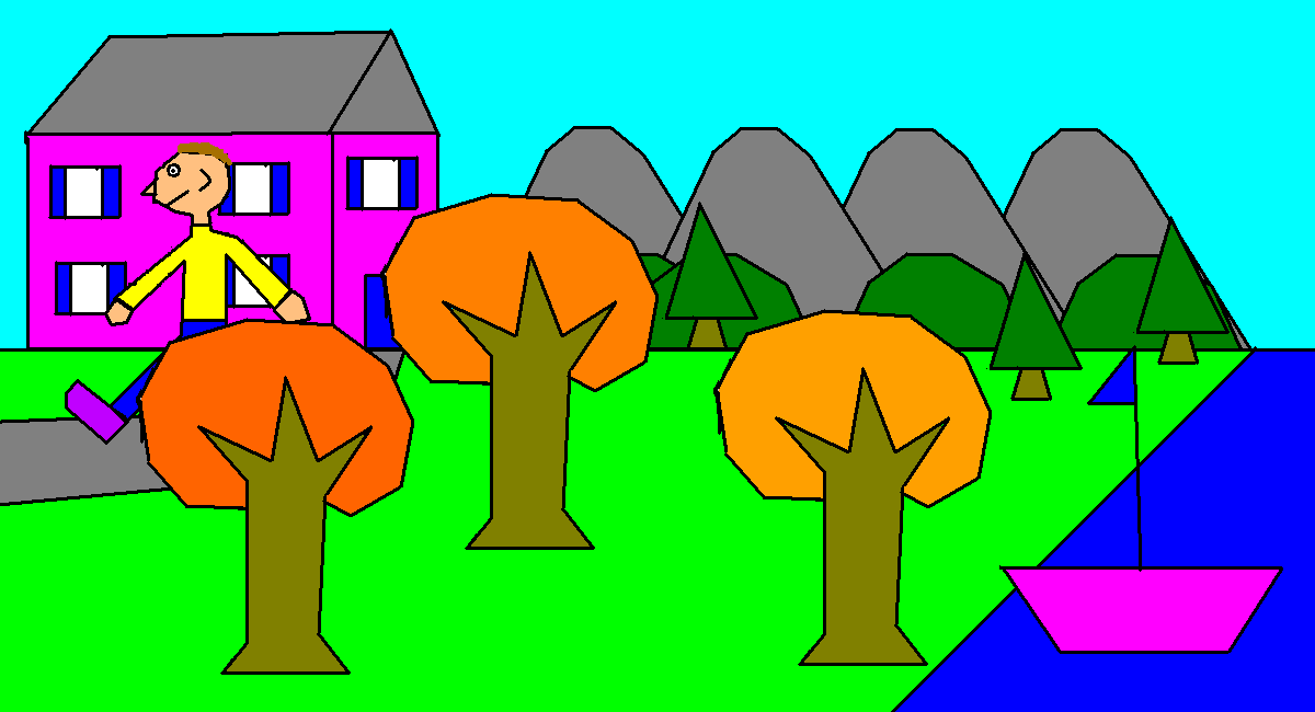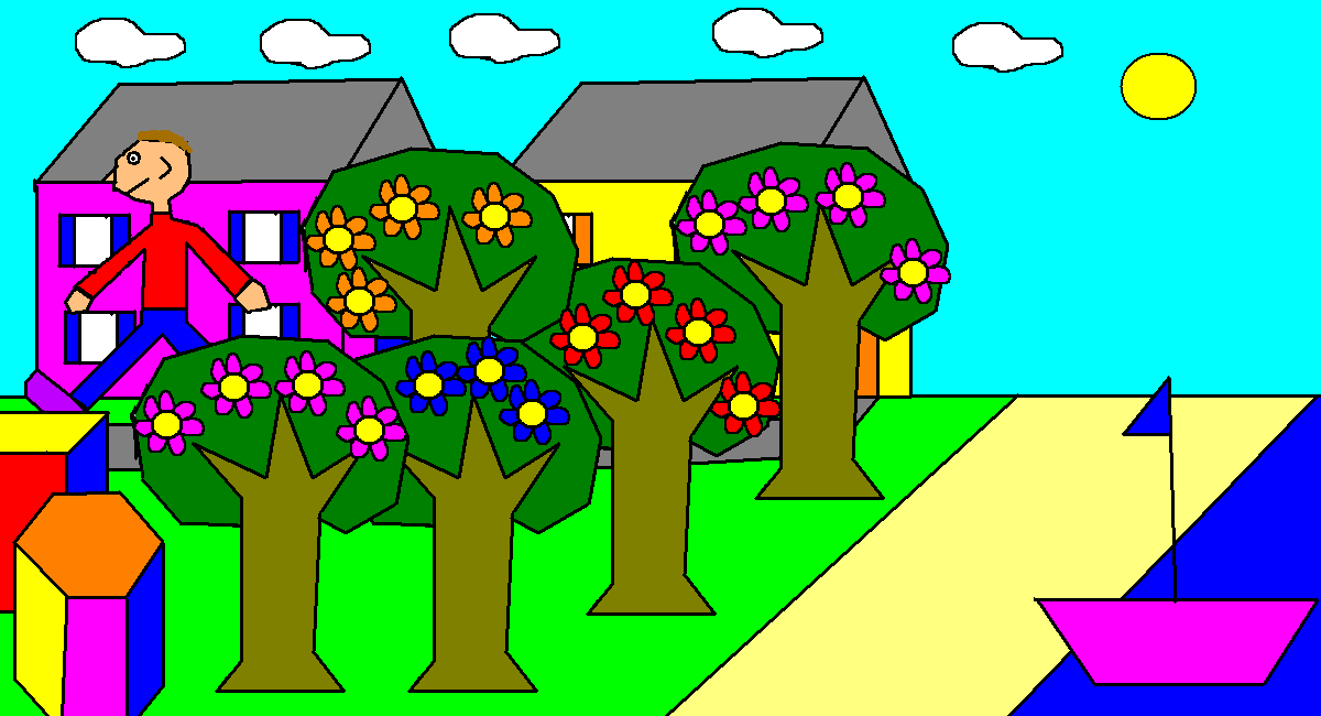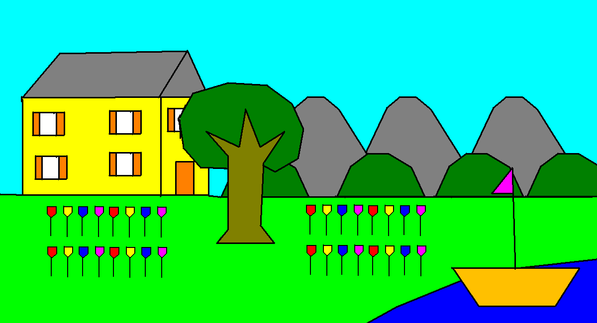 view | a picture of a house, a tree, a boat and some flowers |