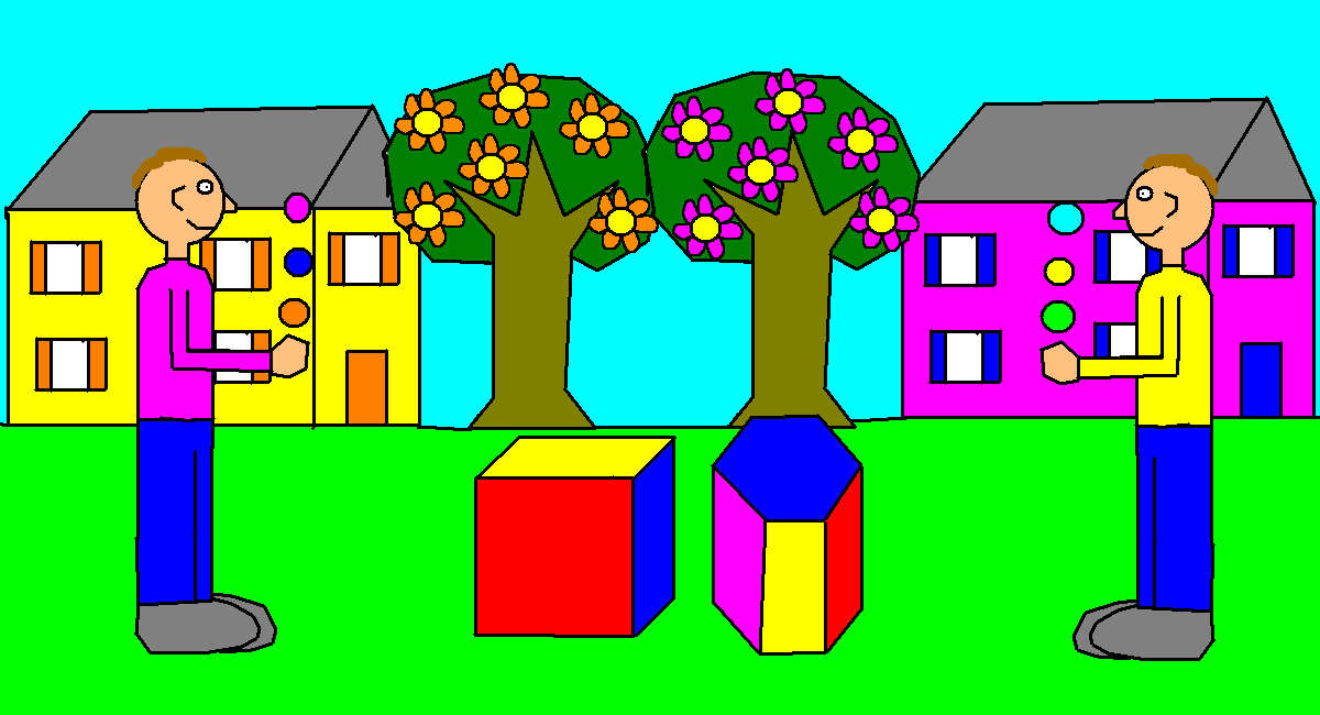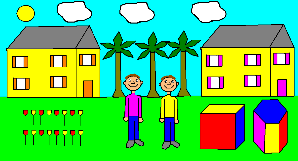 view | a picture of 2 guys with palm trees and houses in the background |
