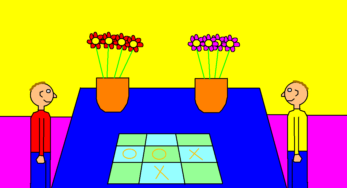 view | a picture of 2 boys playing tic tac toe inside |